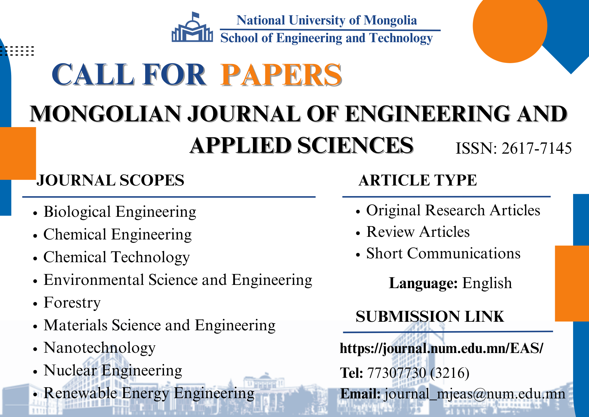 ИТС-иас эрхлэн гаргаж буй Mongolian Journal of Engineering and Applied Sciences сэтгүүл нь шинэ өнгө төрх, нийтлэлийн бодлоготойгоор 2025 оны дугаартаа өгүүлэл авч байна. Энэ дугаараас эхлэн сэтгүүл 100% англи хэл дээр гарах бөгөөд "МУИС-ын Профессор багшийн албан тушаалын зэрэглэл ахиулах, ажлын гүйцэтгэх журам" -ын 7.1Б1.4 буюу 3 Ббц-аар тооцогдох боломжтой болно.