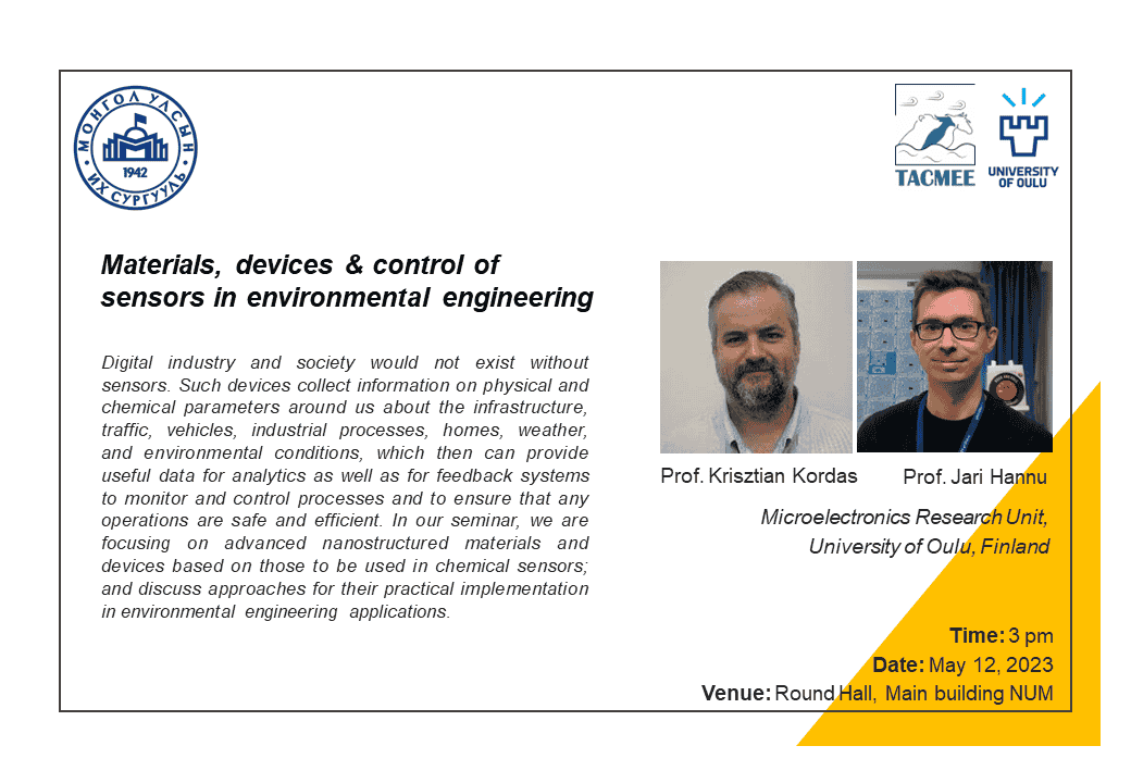 Энэхүү төслийн хүрээнд МУИС-ийн Инженер, технологийн сургуульд хэрэгжиж буй “Хүрээлэн буй орчны инженерчлэл”-ийн бакалаврын хөтөлбөрийг шинэчлэх, магистрын сургалтын хөтөлбөрийг боловсруулж хэрэгжүүлэх, “Хүрээлэн буй орчны инженерчлэл” -ийн сургалтын лабораторийн гарын авлага, тоног төхөөрөмжөөр хангах ажлуудыг хийж гүйцэтгэсэн. Төслийн үйл ажиллагаа болон үр дүнг эндээс (https://tacmee.eu/) дэлгэрүүлж харна уу.