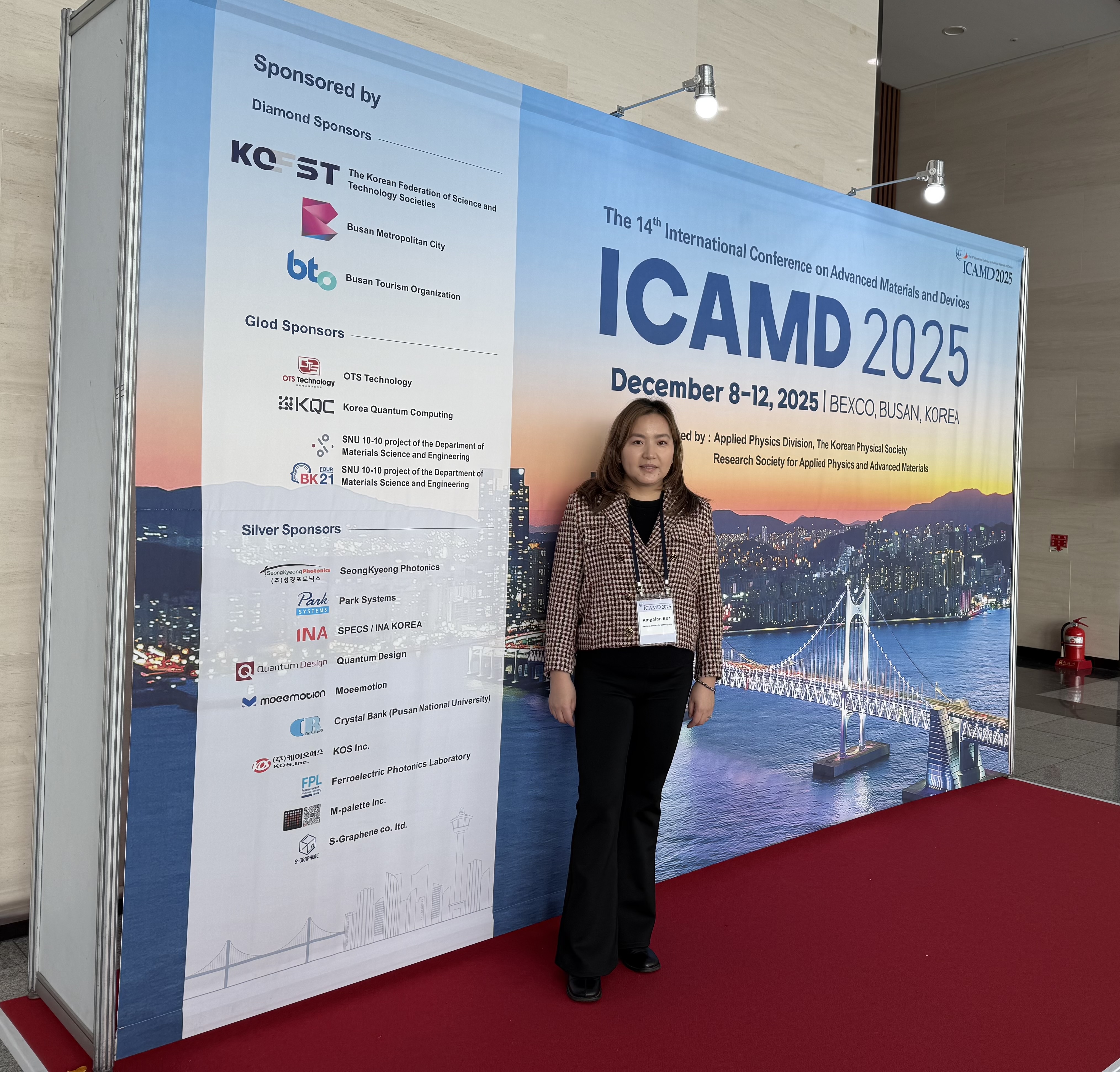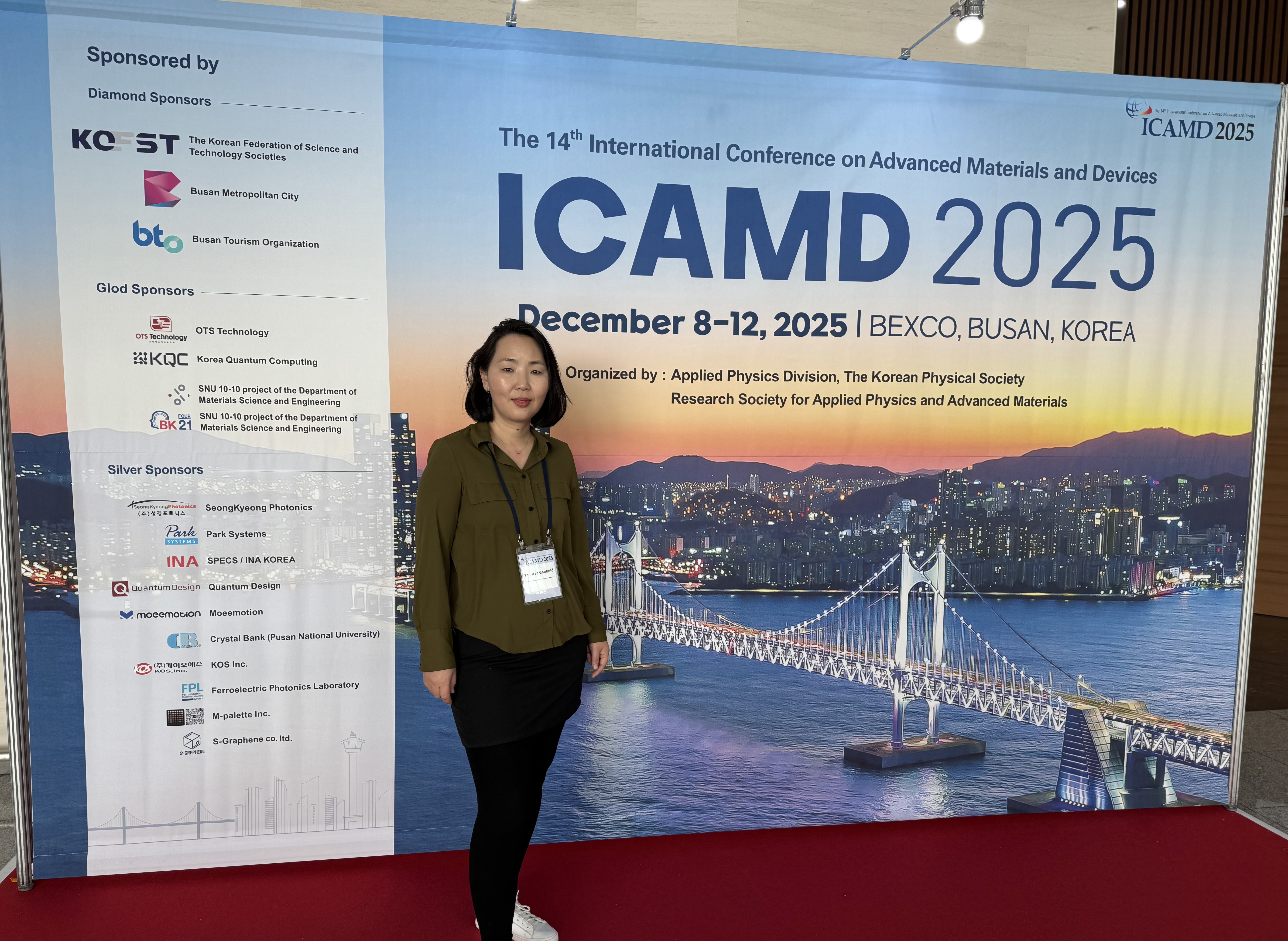 ИТС-ийн Хими, биологийн инженерчлэлийн тэнхимийн дэд профессор Б.Амгалан, дэд профессор Г.Тамираа болон Химийн инженерчлэл хөтөлбөрийн оюутан Б.Ундрал нар БНСУ-ын Бусан хотод зохион байгуулагдсан “14th International Conference on Advanced Materials and Devices (ICAMD2025)” олон улсын эрдэм шинжилгээний хуралд 2025 оны 12 дугаар сарын 08-12ны өдрүүдэд амжилттай оролцлоо.