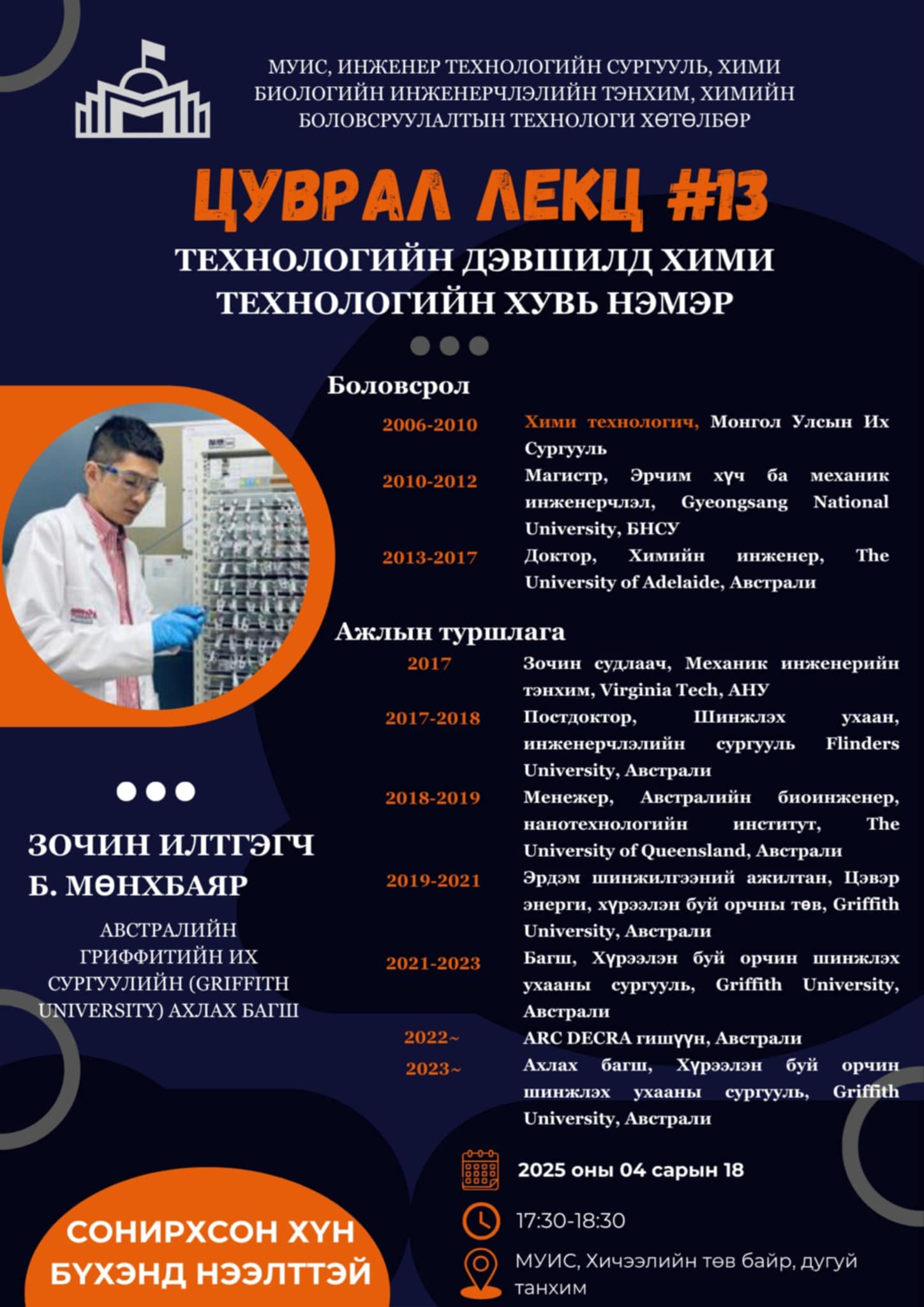 МУИС, ИТС-ийн Хими, биологийн инженерчлэлийн тэнхимийн Химийн боловсруулалтын технологи хөтөлбөрөөс хими технологич мэргэжлийг олон нийтэд таниулах, химийн технологи, инженерчлэлийн хөтөлбөрөөр суралцаж буй оюутнуудын мэдлэгийг өргөжүүлэх зорилгоор цуврал лекцүүдийг зохион байгуулж байгаа билээ.