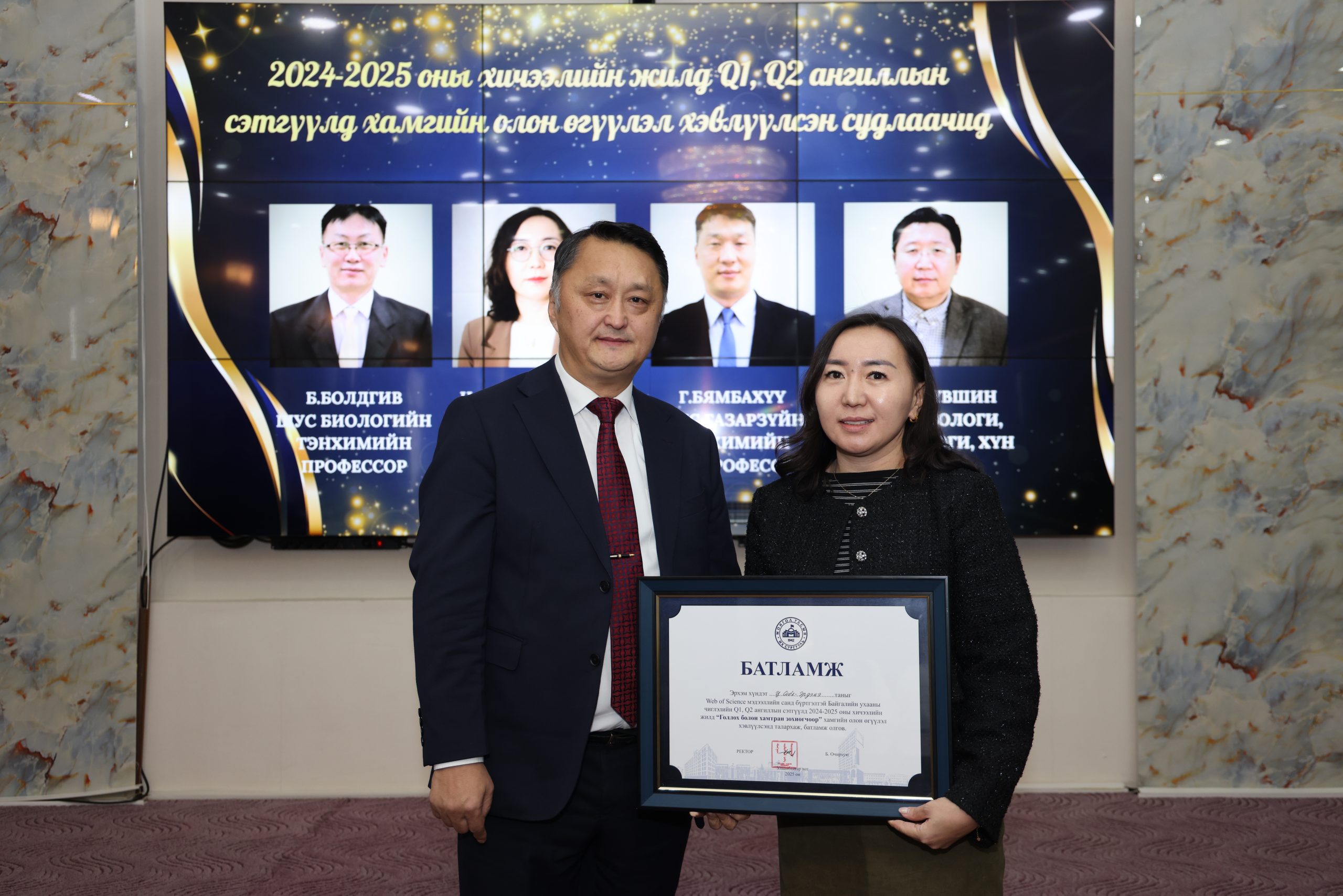Web of Science мэдээллийн санд бүртгэлтэй Q1, Q2 ангиллын сэтгүүлд голлох зохиогчоор хамгийн олон бүтээл хэвлүүлсэн судлаачдаар Хими, биологийн инженерчлэлийн тэнхимийн профессор Ж.Батхүү, Хүрээлэн буй орчин, ойн инженерчлэлийн тэнхимийн профессор Н.Батхүү нар,