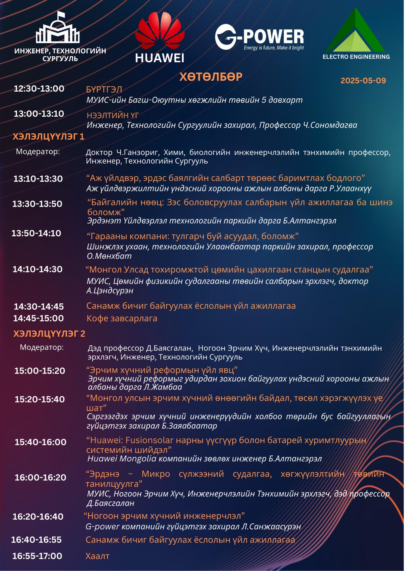 Мөн профессор, багш, оюутнуудын шинэлэг санаа, судалгааны үр дүнг танилцуулах бүтээлийн үзэсгэлэнг олон нийтэд нээлттэй толилуулна. Таныг энэхүү чухал арга хэмжээнд хүрэлцэн ирж, байгалийн нөөцийн зохистой ашиглалт, сэргээгдэх эрчим хүчний хөгжлийг дэмжих үйл хэрэгт бодит хувь нэмрээ оруулахыг урьж байна.