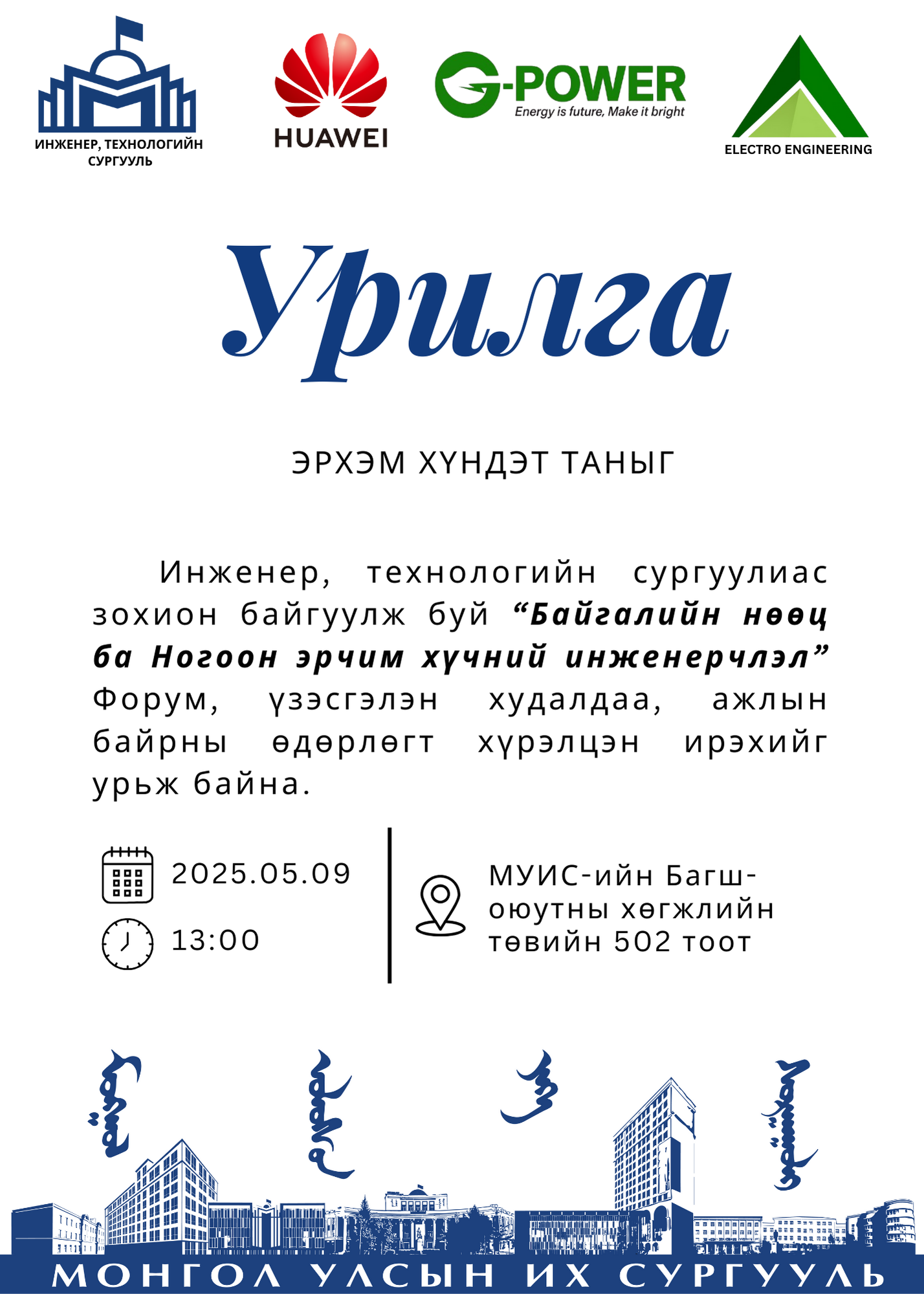 Монгол Улсын Их Сургуулийн Инженер, Технологийн сургууль нь 2025 оны 05 дугаар сарын 09-ний өдөр “Байгалийн нөөц ба Ногоон эрчим хүчний инженерчлэл” сэдвийн хүрээнд нээлттэй хэлэлцүүлэг, ажил олгогч ба оюутнуудын уулзалт, профессор, багш, судлаач оюутнуудын бүтээлийн үзэсгэлэн, төрөл бүрийн модны үрслэгээний үзэсгэлэн худалдаа зэрэг цогц үйл ажиллагааг МУИС-ийн Багш, оюутны хөгжлийн төвд зохион байгуулах гэж байна.