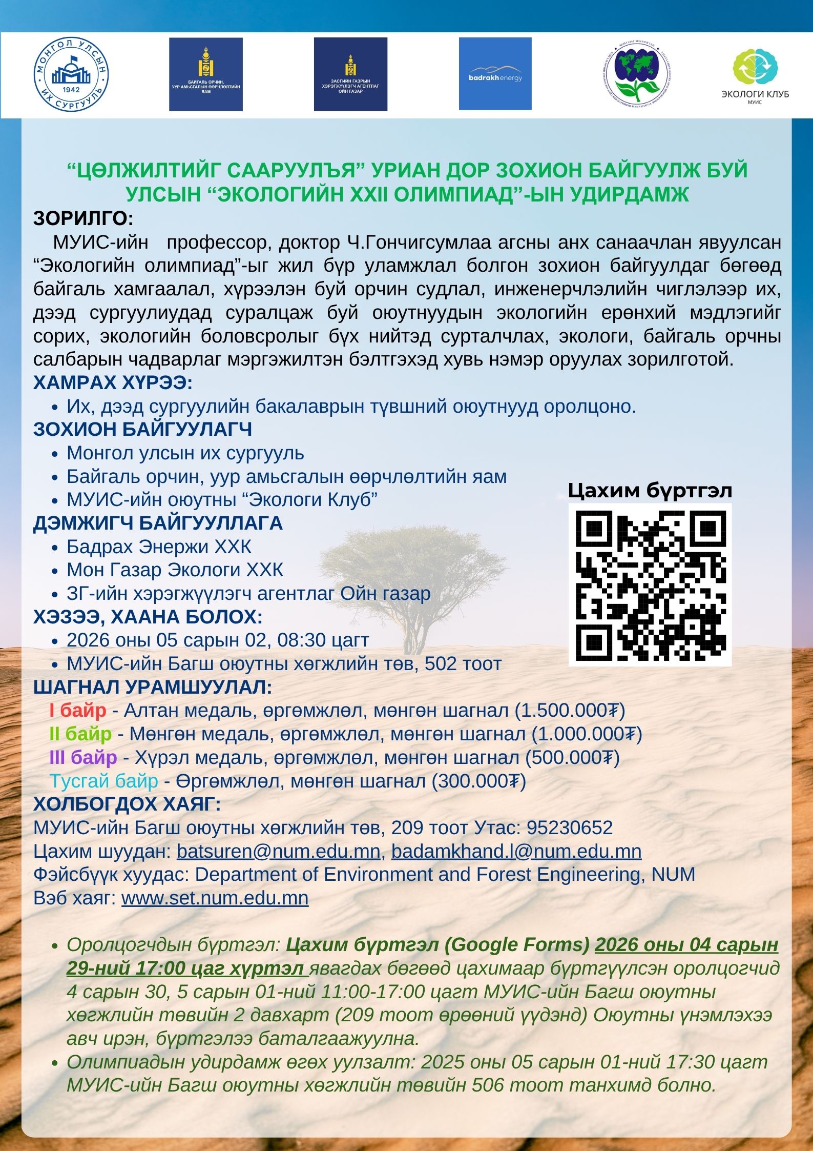 Байгаль хамгаалал, хүрээлэн буй орчин, инженерчлэлийн чиглэлээр суралцаж буй оюутнууд та бүхнийг жил бүр уламжлал болон зохион байгуулдаг улсын экологийн олимпиадад оролцохыг урьж байна.