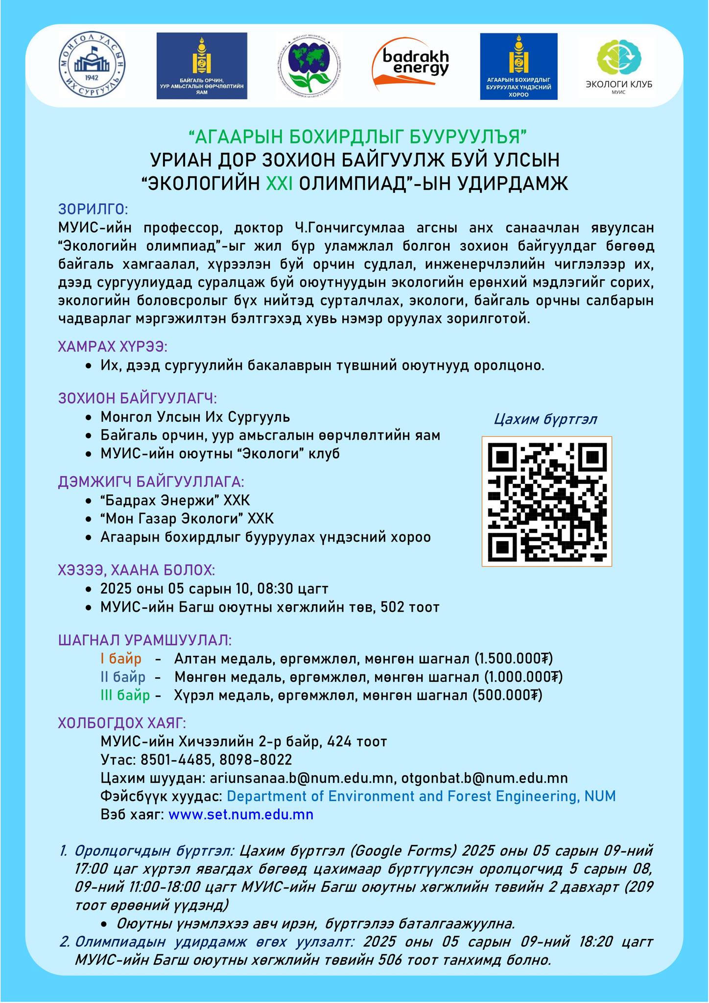 ✅ Байгаль хамгаалал, хүрээлэн буй орчин, инженерчлэлийн чиглэлээр суралцаж буй оюутнууд та бүхнийг жил бүр уламжлал болон зохион байгуулдаг улсын экологийн олимпиадад оролцохыг урьж байна.