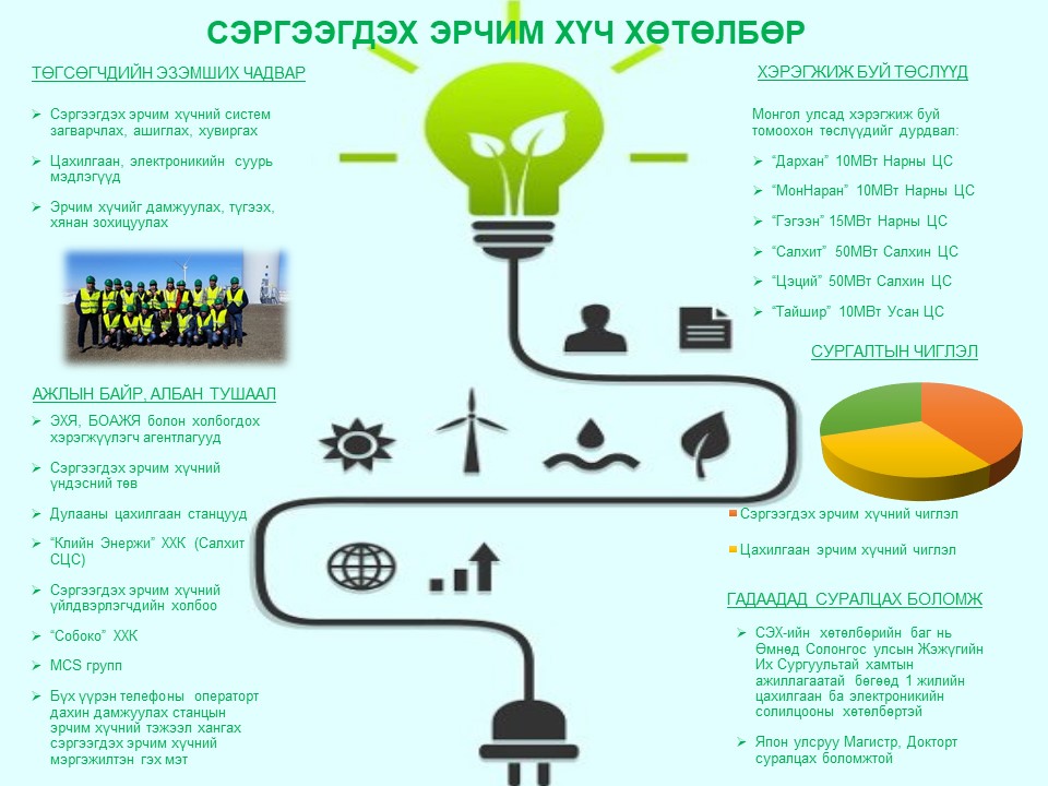 A. ШУ-ны хөгжил болон хөдөлмөрийн зах зээлийн хэрэгцээ шаардлага – Манай улс 2007 оны 1 сард Сэргээгдэх эрчим хүч (СЭХ)-ний хуулийг УИХ-аар баталж, СЭХ-ний мэргэжлийн боловсон хүчин бэлтгэх тухай 5.3.4-д зүйлд тусгасан байдаг. Мөн түүнчлэн, Монгол улс нь 2005 онд Сэргээгдэх эрчим хүчний үндэсний хөтөлбөрийг УИХ-аар баталж, 2020 он хүртэл эрчим хүчний үйлдвэрлэлд СЭХ-ний эзлэх хувь хэмжээг 20%-25% болгон нэмэгдүүлэх зорилт тавин ажиллаж байна. Манай улсын эрчим хүчний хэрэглээ 2020 онд 2.3 ГВт болон нэмэгдэнэ гэж Эрчим хүчний яам урьдчилан таамаглаж байгаа бөгөөд, СЭХ-ний үндэсний хөтөлбөрийн зорилтыг биелүүлэхийн тулд 550 гаран МВт-ын хүчин чадалтай СЭХ-ний үүсгүүр нэмж суурилуулах шаардлагатай юм. Сүүлийн үед манай улсад их чадлын салхин цахилгаан станц, нарны фотоцахилгаан үүсгүүр (НФЦҮ), усны цахилгаан станц, нарны вакуум коллектор, газрын гүний дулааны шахуурга, био-эрчим хүчний үүсгүүрийг өргөнөөр ашигладаг болоод байна. Жишээ нь малчин айл бүр НФЦҮ хэрэглэж, нарны фотоцахилгаан үүсгүүрийн дэлгэц үйлдвэрлэл нэмэгдэж, НФЦҮ-ийн үйлдвэрэл, худалдаа, зохиомж зураглал, угсралт суурилуулалт, засвар үйлчилгээний салбарт мэргэжилтний эрэлт хэрэгцээ эрс өсч байна.