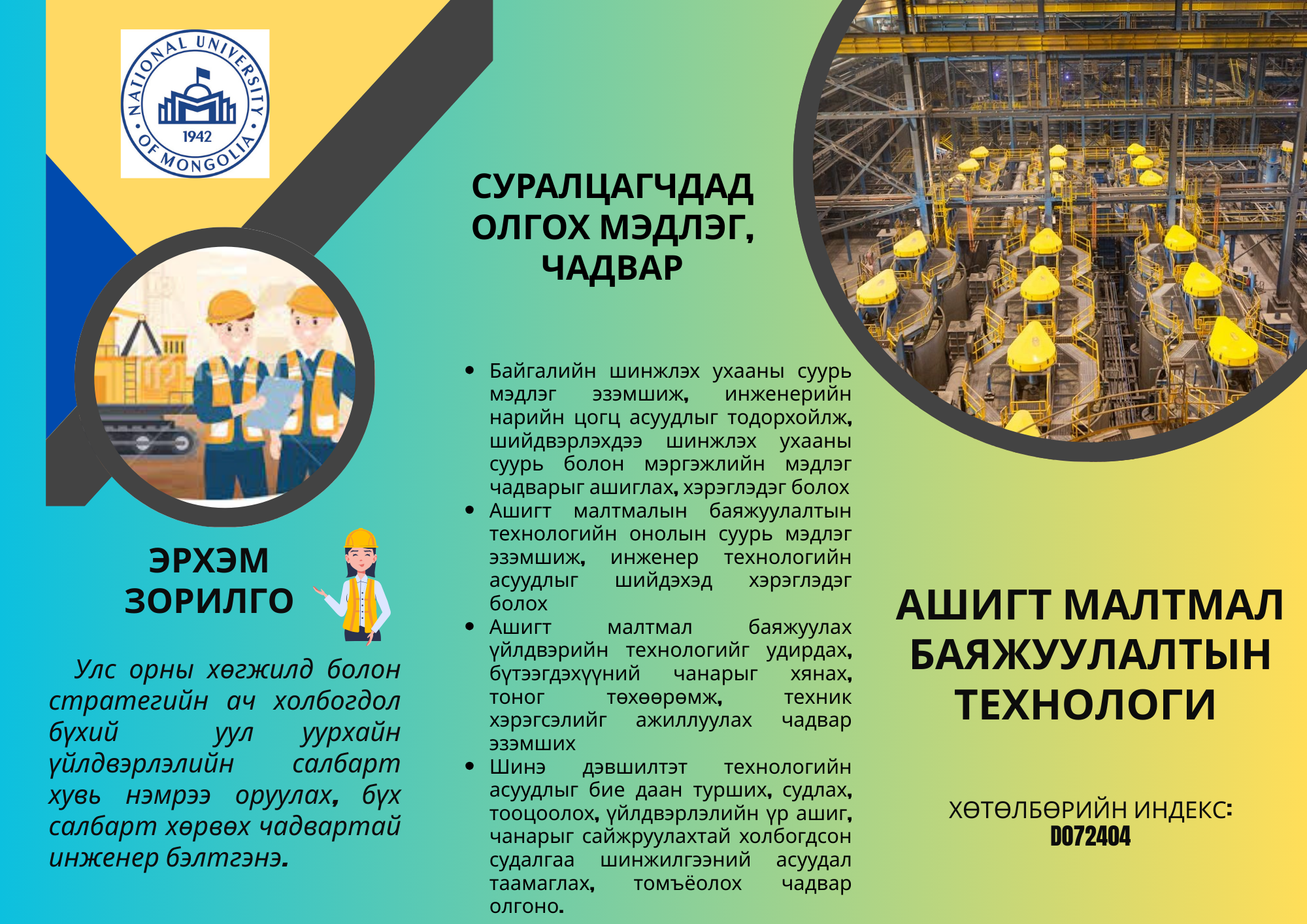 Хөтөлбөрийн хураангуй: Ашигт малтмалын баяжуулалтын технологи” бакалаврын сургалтын хөтөлбөр нь Монгол улсад ажиллаж буй, эрдэс хүдрээс өнгөт болон үнэт металлуудыг баяжуулах үйлдвэр, нүүрсийг баяжуулах үйлдвэр болон баяжмалуудыг экспортлогч компаниуд, газар доор уусган олборлох технологиор ураны шар нунтаг гарган авах үйлдвэр, аж ахуйн нэгж, эрдэс болон нүүрсний шинжилгээний лабораториудад ажиллах инженер, технологич, техникийн ажилтан, шинжээч, лаборант зэрэг боловсон хүчнийг энэ чиглэлийн мэргэжилтэнд тавигдах олон улсын шаардлагад нийцүүлэн бэлтгэн гаргана.